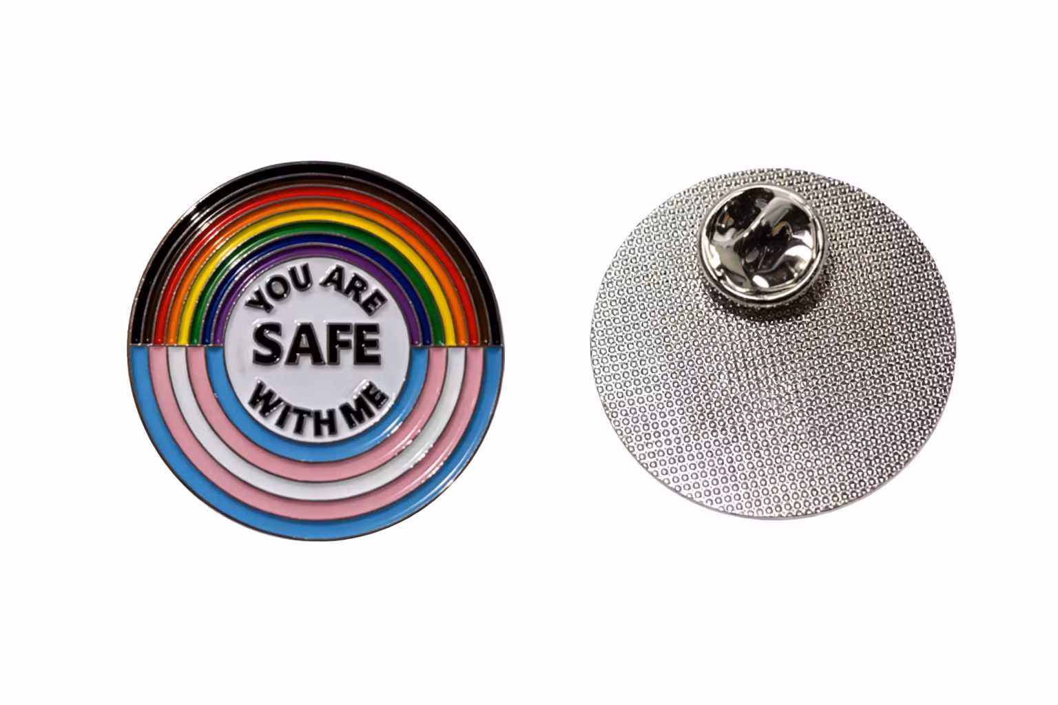 Et lite symbol med stor betydning. Denne regnbuepin`en er laget for deg som vil vise trygghet, støtte og inkludering – på jobb, skole, festival eller i hverdagen. Den har et elegant, blankt uttrykk med regnbuefarger og teksten “YOU ARE SAFE WITH ME” i sentrum. Bakdelen har solid metall og klassisk låsemekanisme som holder pinnen sikkert på plass.