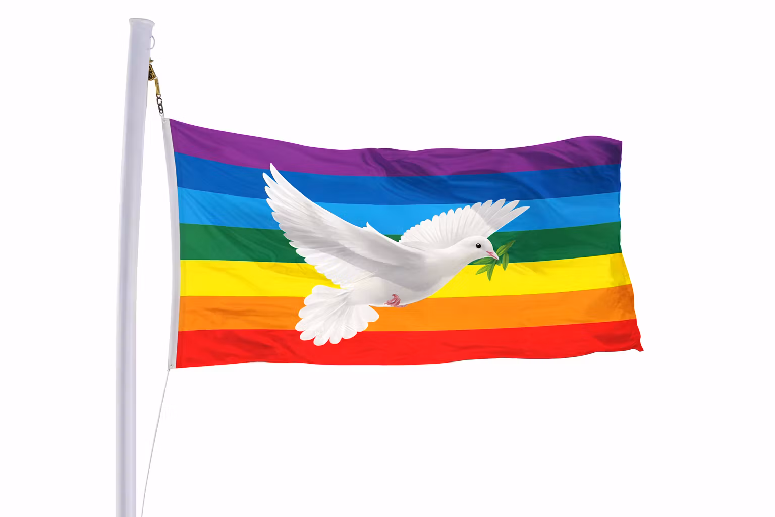 Et sterkt symbol for håp, fred og inkludering. Dette regnbueflagget med den hvite duen og olivengrenen kombinerer to universelle budskap – mangfold og fred – i ett vakkert design. Perfekt til Pride, markeringer, festivaler eller som dekor hjemme og på arbeidsplassen.