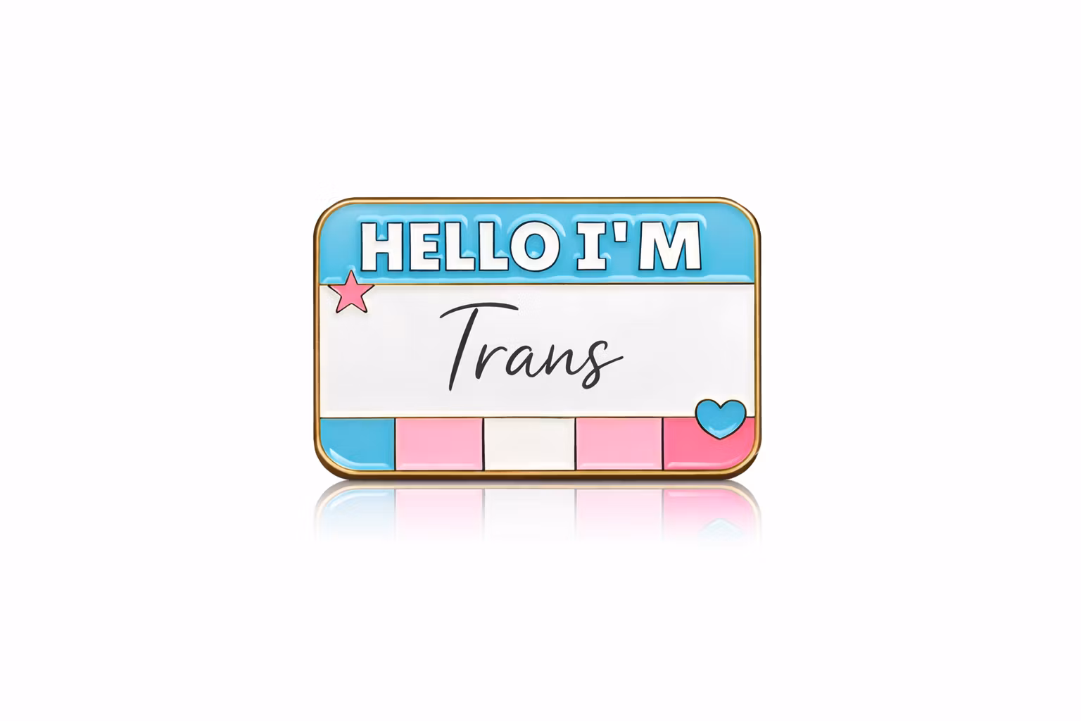 Et tydelig, varmt og inkluderende symbol for identitet, stolthet og fellesskap.HELLO I’M Trans‑pinèn er designet som et klassisk navneskilt med trans pride‑fargene, ren hvit bakgrunn og gyllen metallkant som gir et eksklusivt uttrykk. Perfekt til jakker, vesker, sekker og arbeidstøy.
