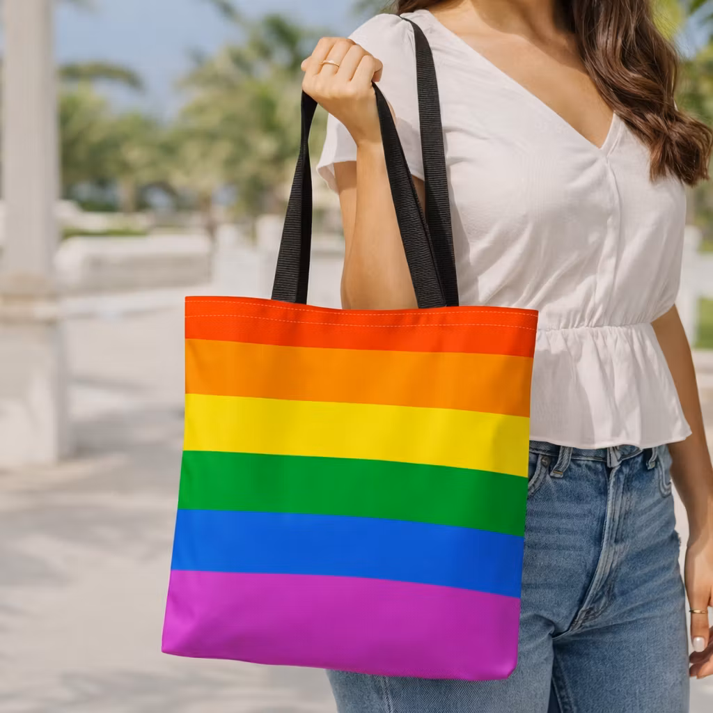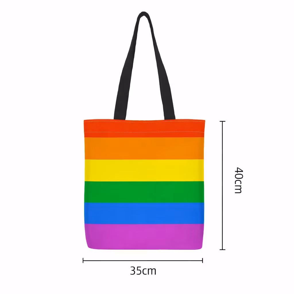 En fargerik og slitesterk tote bag som bærer budskapet om kjærlighet og inkludering. Regnbuevesken er laget i solid canvas med svarte stropper – perfekt til både hverdag og feiring.